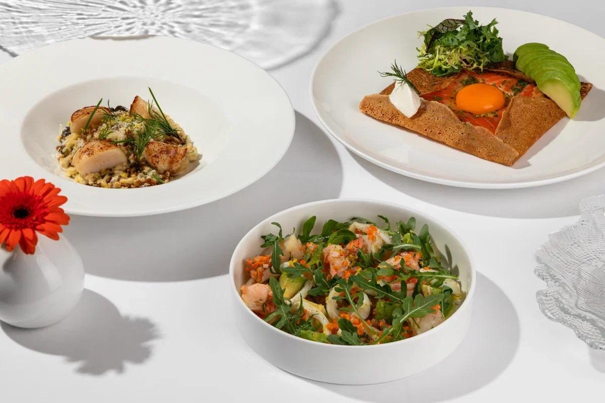 Среди салатов — тёплый микс из морепродуктов: кальмары, нежные гребешки и тигровые креветки с авокадо и ароматной овощной заправкой. В горячих блюдах — венгерский гуляш: говядина, обжаренная до румяной корочки, с томатами, красным вином и специями в густом бульоне. Ещё одна яркая позиция — орзо с гребешками и сморчками: паста в сливочном соусе с трюфелем, лесными грибами, лимоном и пармезаном.