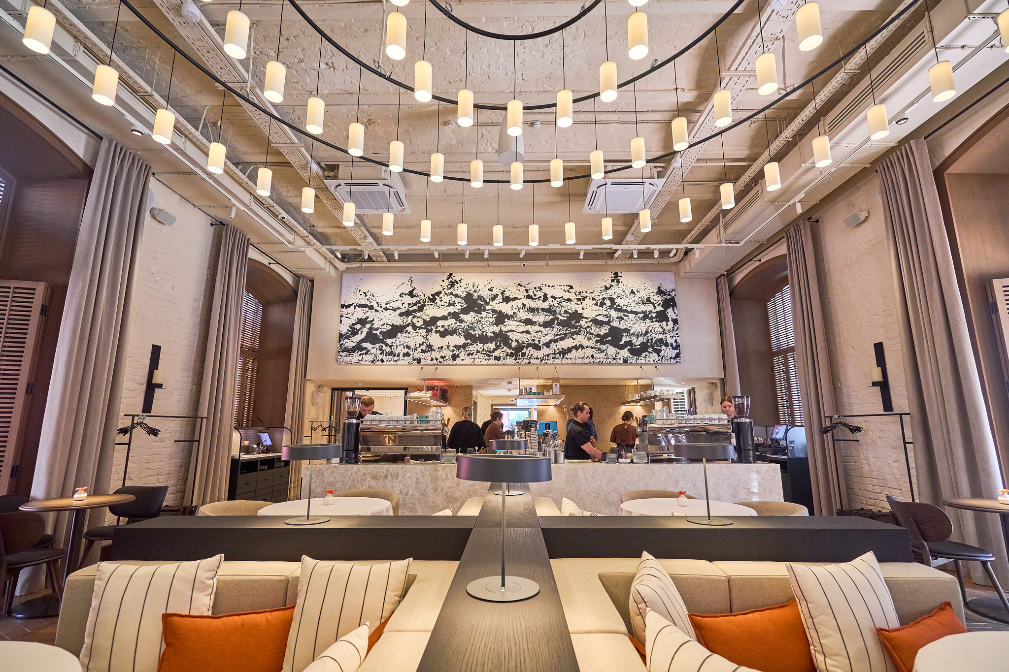 Центральным элементом в оформлении зала на первом этаже стала массивная светодиодная люстра SANTA&COLE из Испании. Она создаёт мягкое, равномерное освещение, которое идеально подходит для большого пространства.