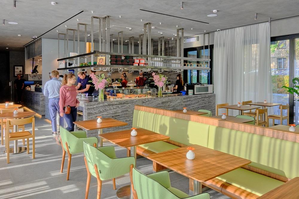Утром в новой Кофемании вам будут приносить ленивые вареники с творогом, страчателлу с душистой земляникой и главный хит меню завтраков – Бенедикт на бриоши с лососем. Далее по плану – салат Бора-бора, домашние котлетки из индейки, гречневая лапша с креветками и курица с рисом и зелёным карри. Для вечера припасена программа итальянская – спагетти и ризотто – или американская: бургеры, которые могут сделать традиционно, с булочкой, либо в зож-стиле – на листьях салата. В отдельном меню – детские колбаски, блинчики и лимонады, а для подросших сладкоежек в витрине разложены нарядные пирожные. Их, как и разнообразную кулинарию Кофемании, при желании можно забрать домой и насладиться ужином в кругу близких.