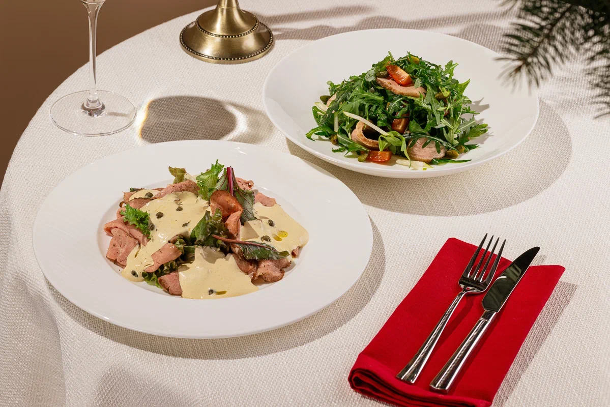 Открывают подборку закуски и салаты. Тёплый салат с морепродуктами — нежный гребешок, кальмар и креветка с авокадо и руколой под лёгкой цитрусовой заправкой на оливковом масле. Ростбиф «Вителло Тонато» — тонко нарезанное мясо с мягким сливочным соусом, салатным миксом и каперсами, создающими изящный баланс вкуса и лёгкой пикантности.