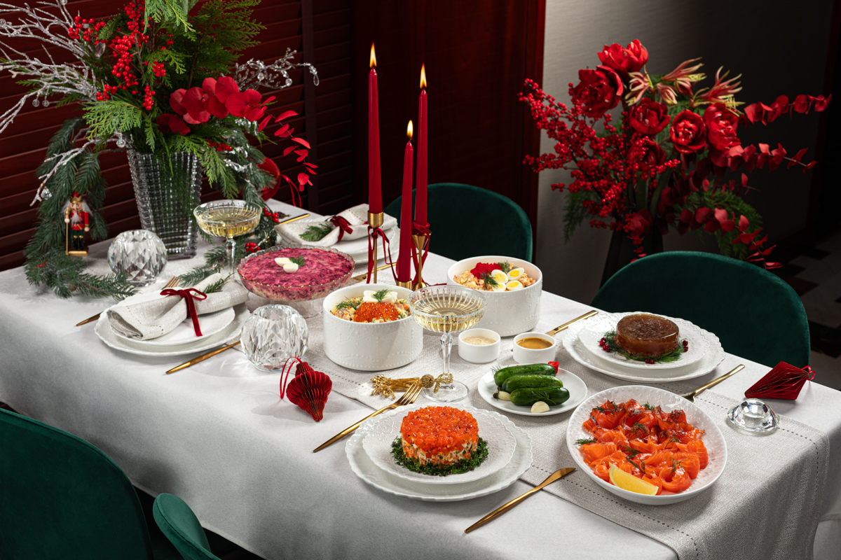 В разнообразном меню каждый найдёт себе блюдо по вкусу. Среди салатов — традиционные мимоза, cелёдка под шубой и, конечно же, оливье: классический с ветчиной или версия для гурманов с крабом. На закуску идеальным выбором станут холодец из телятины и домашние малосольные огурцы, а для любителей рыбы — слабосолёный лосось: классический или трюфельный.