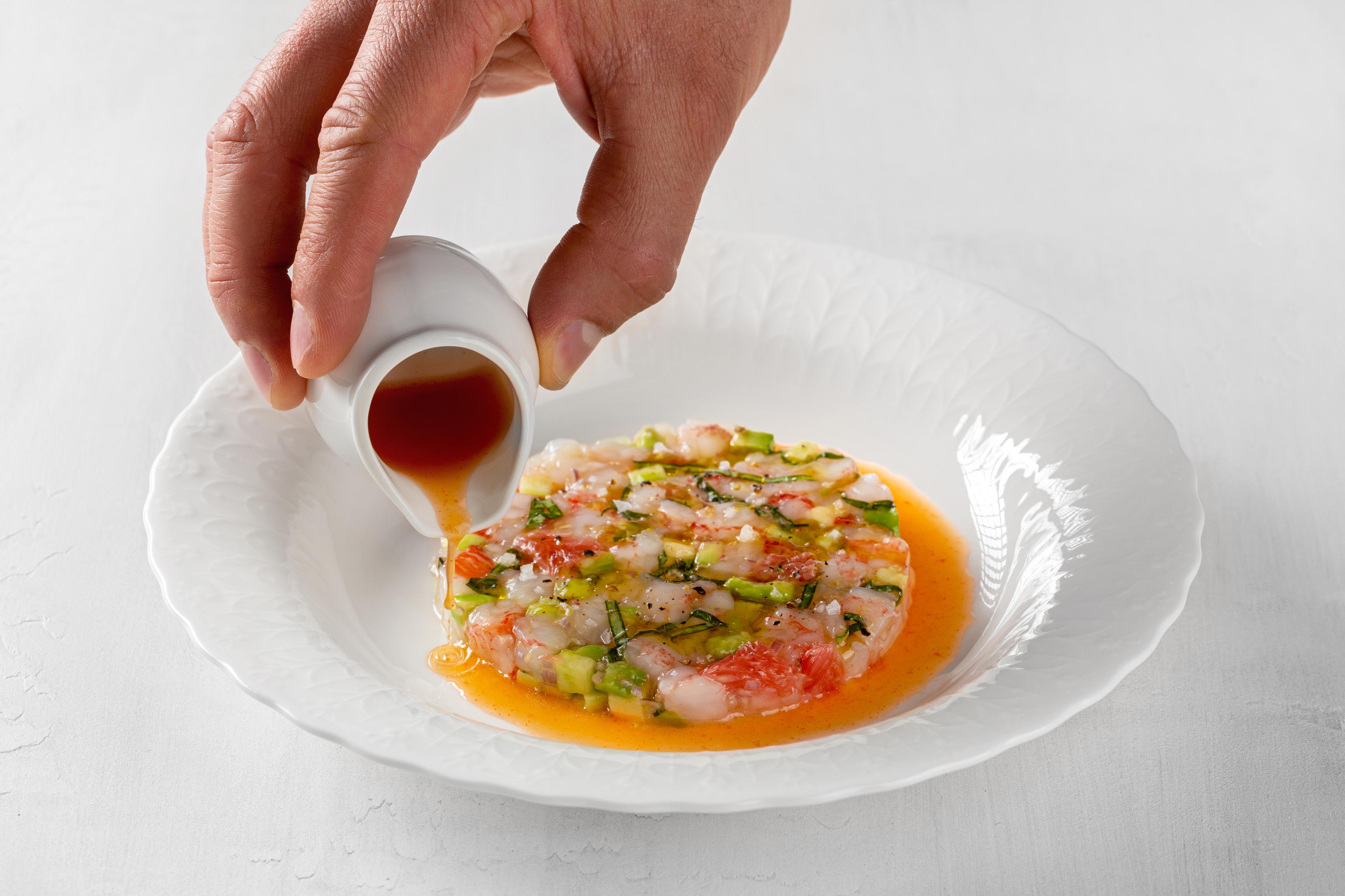 Естественную сладость креветки ама-эби Алексей подчёркивает сбалансированным соусом на основе апельсина и кимчи. Микс зелёных салатов (фенхель, руккола, салатный микс, латук) дополняет яблоком и цитрусами.