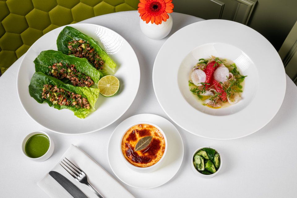 Для севиче из мэгра, редкой средиземноморской рыбы, слайсы из нежной и сочной мякоти маринуют в соусе из сока лайма и маринованной кольраби, добавляя грейпфрут и острый перец. Ещё одна позиция, рецепт которой корнями из Южной Америки, но уже с китайскими мотивами – тако на листьях романо с тартаром из пекинской утки с соусом шисо. Его рекомендуют дополнить соусом на основе листьев шисо и есть прямо руками, начиная со стебля.