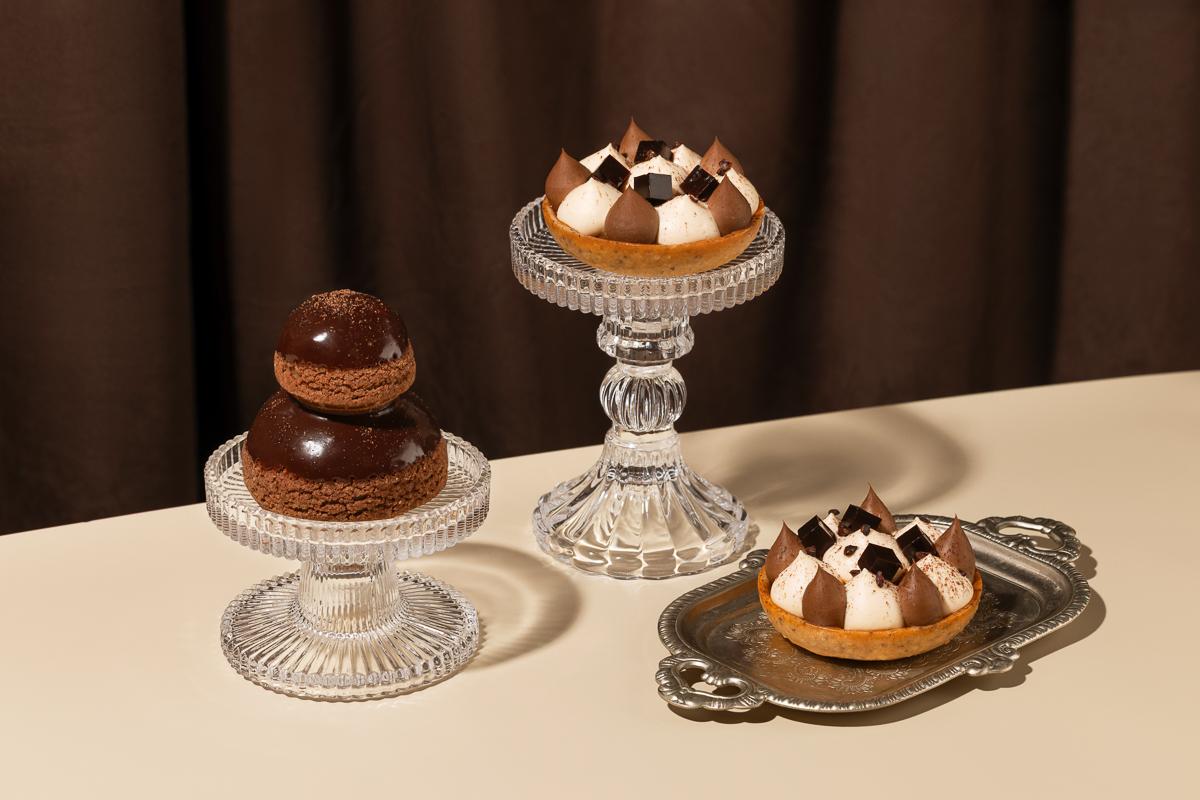Тарт «Тирамису» — многослойный и выразительный: фундучное тесто, шоколадный бисквит мариньи, отличающийся плотной, но нежной текстурой, кофейный сироп, карамелизированные какао-бобы, ванильный крем с маскарпоне и желе с какао создают насыщенную и глубокую вкусовую композицию.